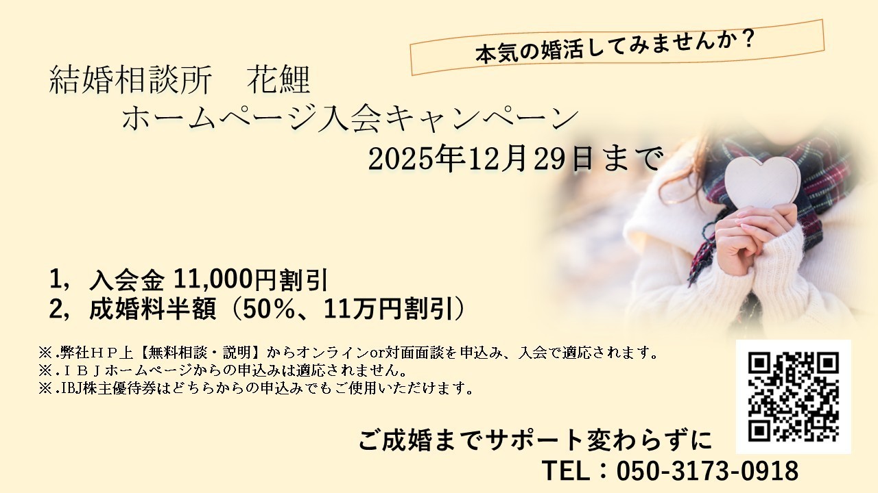 結婚相談所 花鯉~marriage&health partner~が行なっているホームページ割引きの情報をご紹介します。